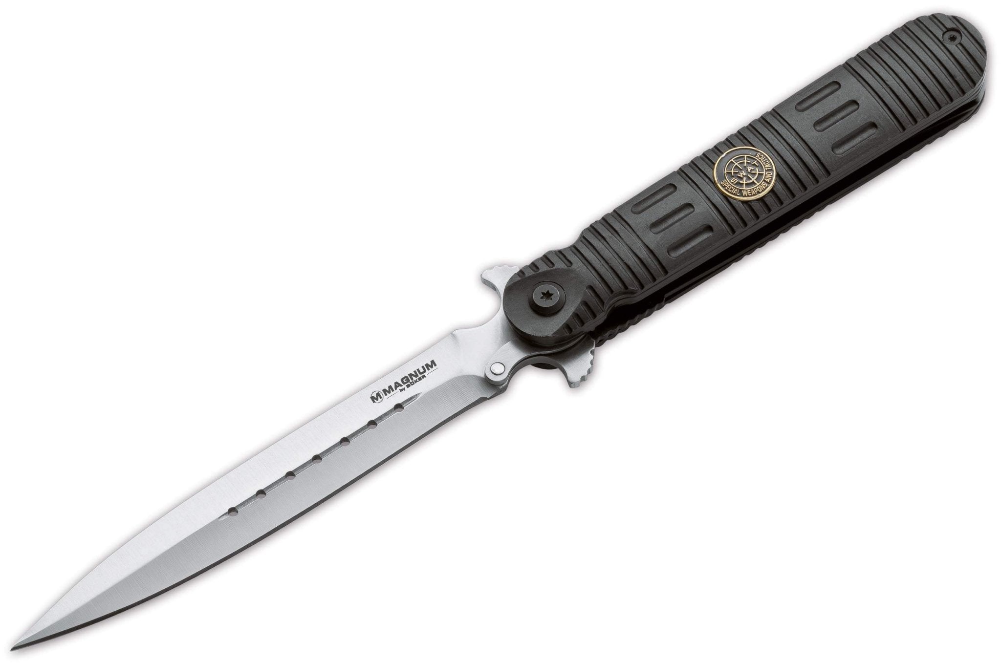The matte gold-coated 440 blade and liners of this Boker Magnum knife create an appealing contrast to the deep black G10 scales. The spring-assisted blade can be opened with ease with the ambidextrous thumb studs. The liner lock reliably secures the opened blade. The black G-10 handle scales offer comfort and security, and the pocket clip can be repositioned from a right hand, tip-down carry to a left-hand, tip-up carry. Beautiful to look at, comfortable to carry, convenient to use, this understated knife nevertheless stands out from the crowd.