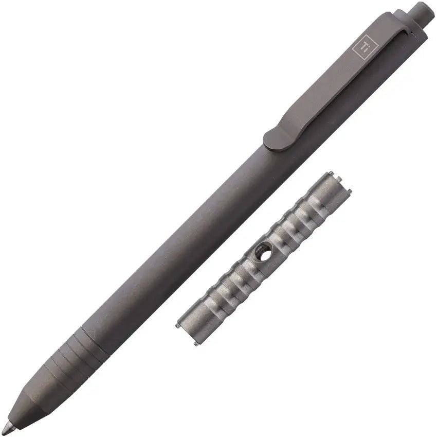 5" overall. Pocket clip. Stonewash finish. Accepts 100 plus refills without any hacks or modifications. Slim profile. Schneider 0.4mm black gel ink refill. Titanium construction. Boxed.